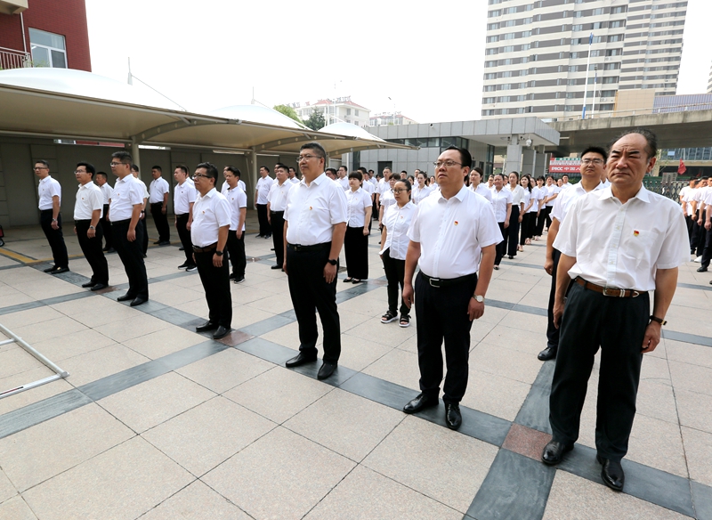 6月30日上午,集團全體干部職工統一列隊參加升國旗儀式;全體黨員在集團書記、董事長方玉新的帶領下共同重溫入黨誓詞,共唱紅色歌曲《沒有共產黨就沒有新中國》《歌唱祖國》;同時,方玉新同志以《點亮紅色燈塔 引領國企遠航》為題為全員講授了黨史學習教育專題黨課;市委黨校教務處顏志強主任作了《救國興國富國強國——中國共產黨百年奮斗史》專題講座。隨后,集團領導一行前往黨員“雙報到”“共駐共建”社區走訪慰問了“光榮在黨50年”老黨員。7月1日,集團全體干部職工集中收聽收看中國共產黨成立100周年慶祝大會實況,共同觀看了紅色主旋律教育影片《1921》。